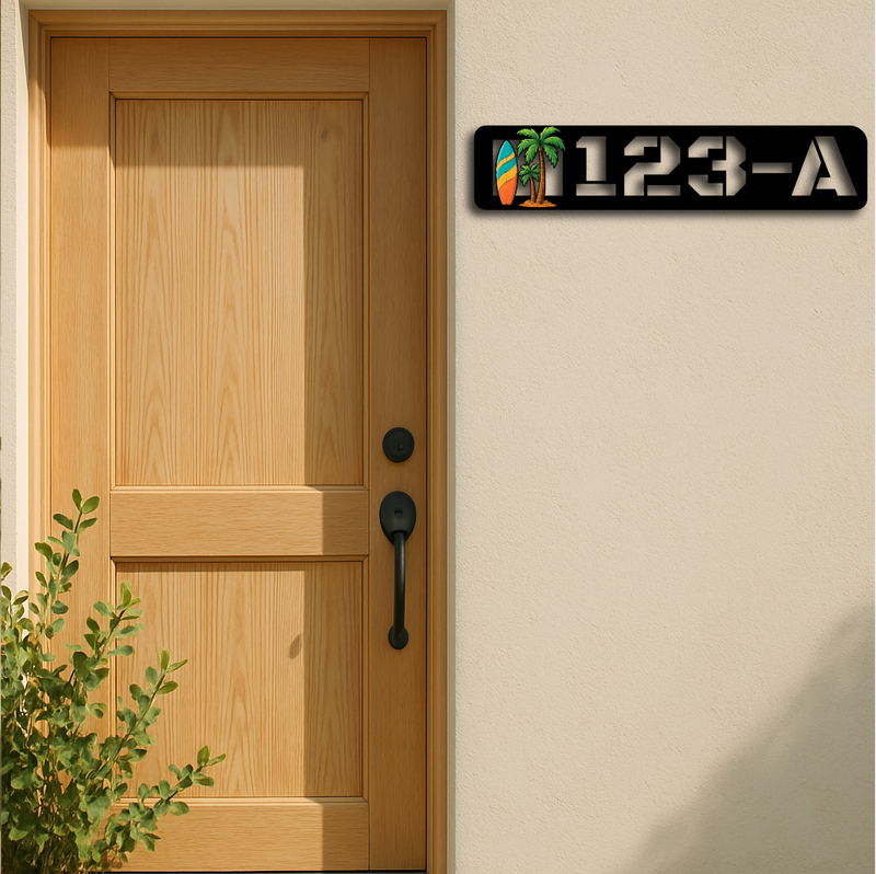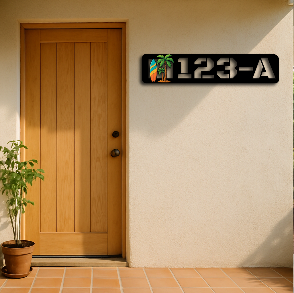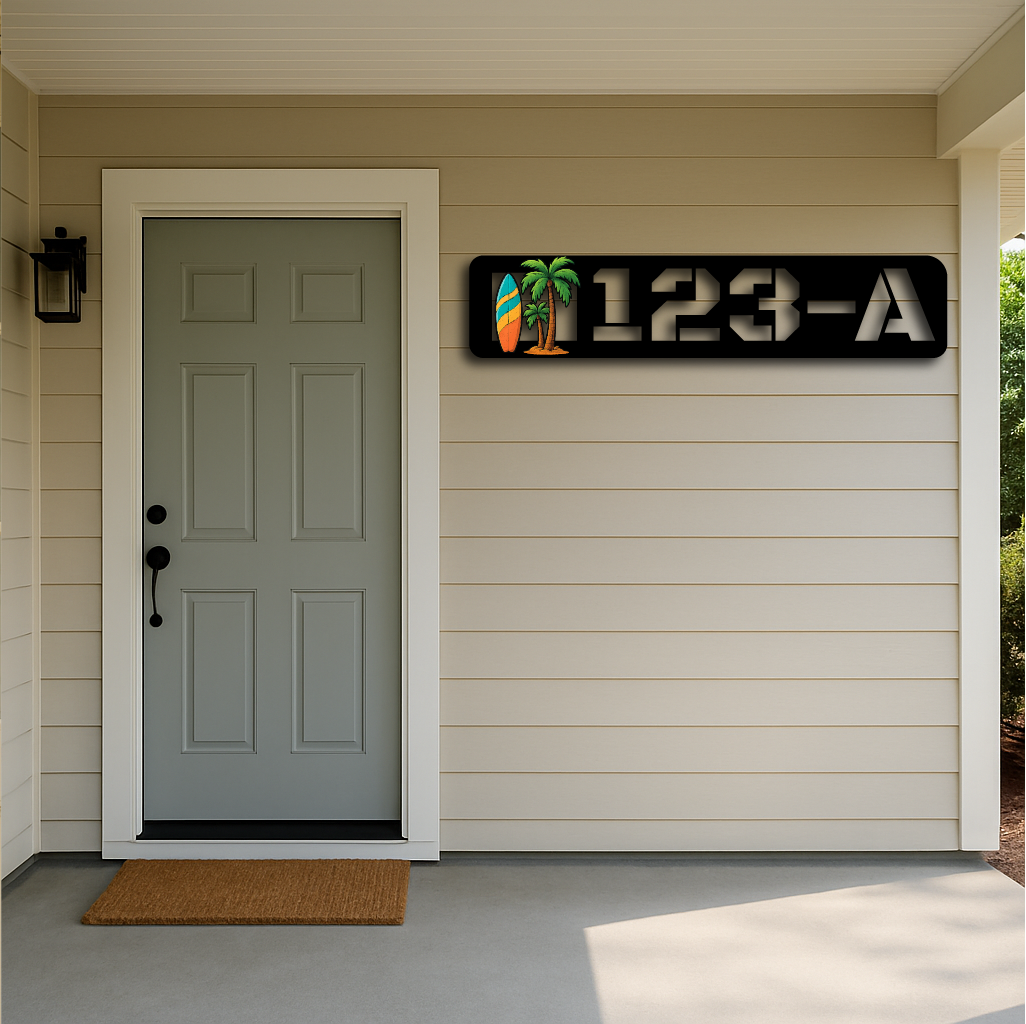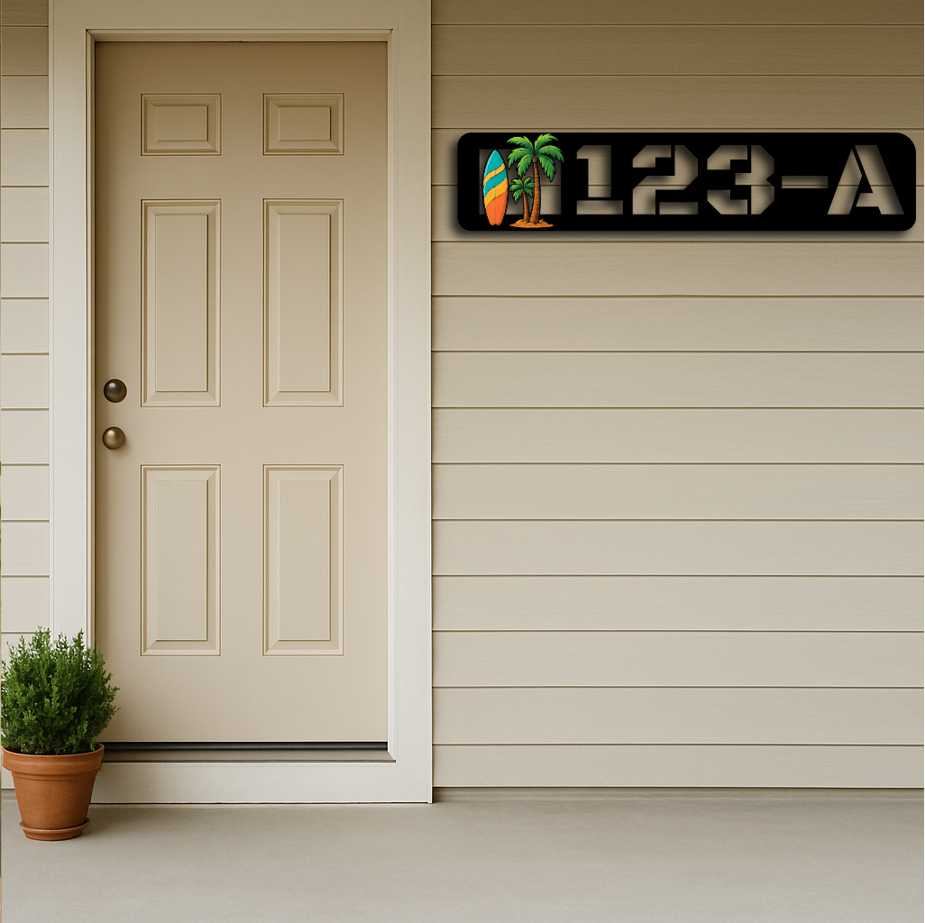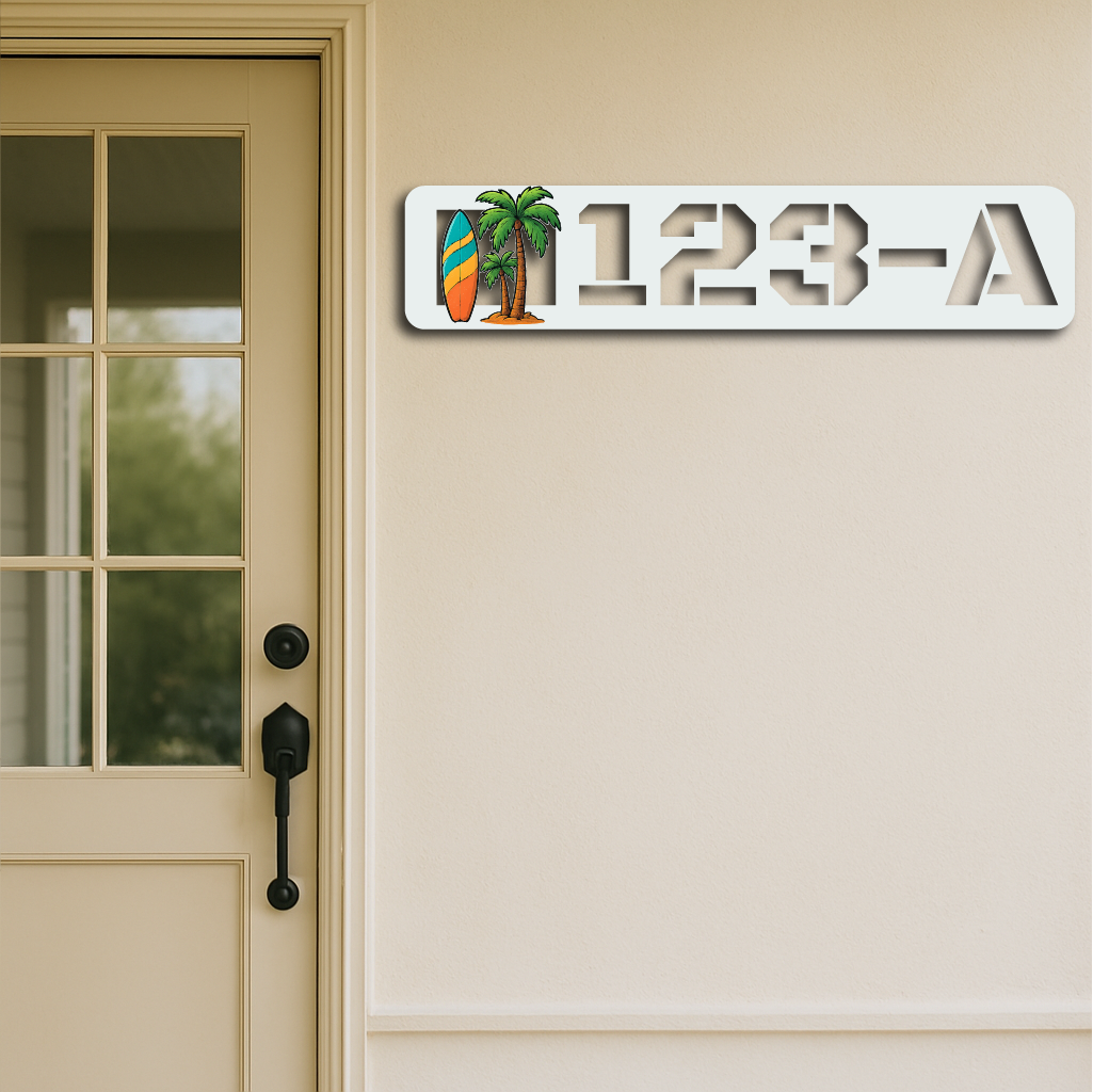 Custom Palm Tree & Surfboard Metal House Number Sign – Coastal Beach Address Plaque