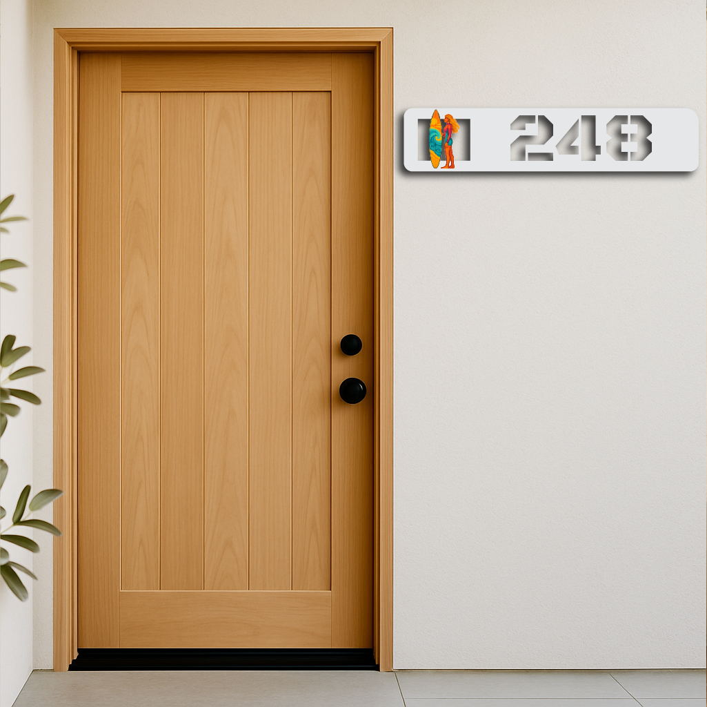 Add a bold and vibrant coastal touch to your home with this Surfer Girl-Themed Metal House Number Sign. Featuring a colorful UV-printed surfer girl holding a retro surfboard, combined with precision laser-cut numbers, it’s the perfect accent for beach houses, vacation rentals, or surf shacks.