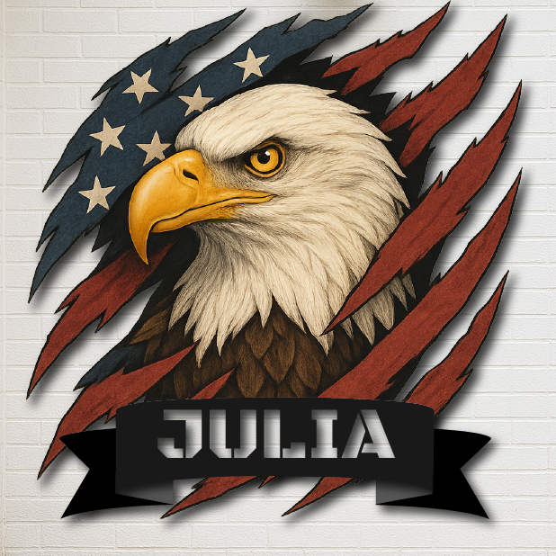 Declare your fierce loyalty and strength with Liberty Claw, a personalized wall sign featuring a detailed bald eagle bursting through claw marks of the American flag. This powerful visual celebrates patriotism and personal identity—perfect for veterans, gym lovers, or proud Americans.