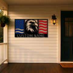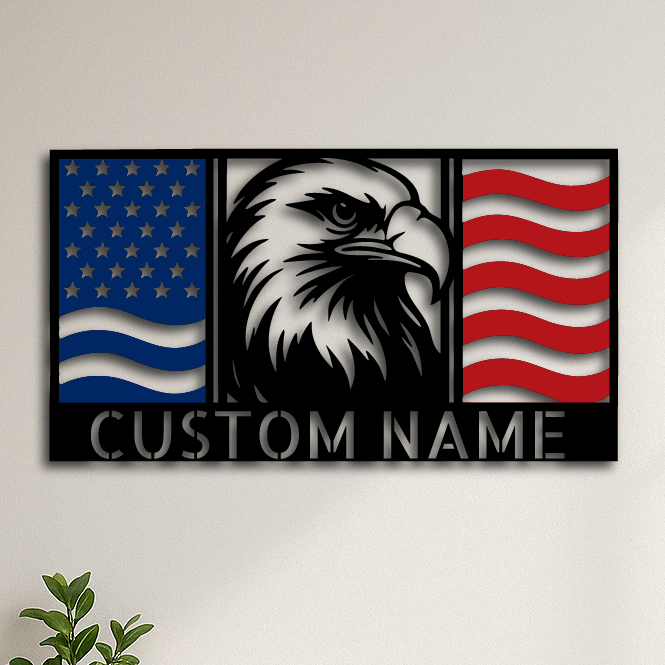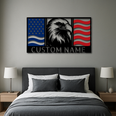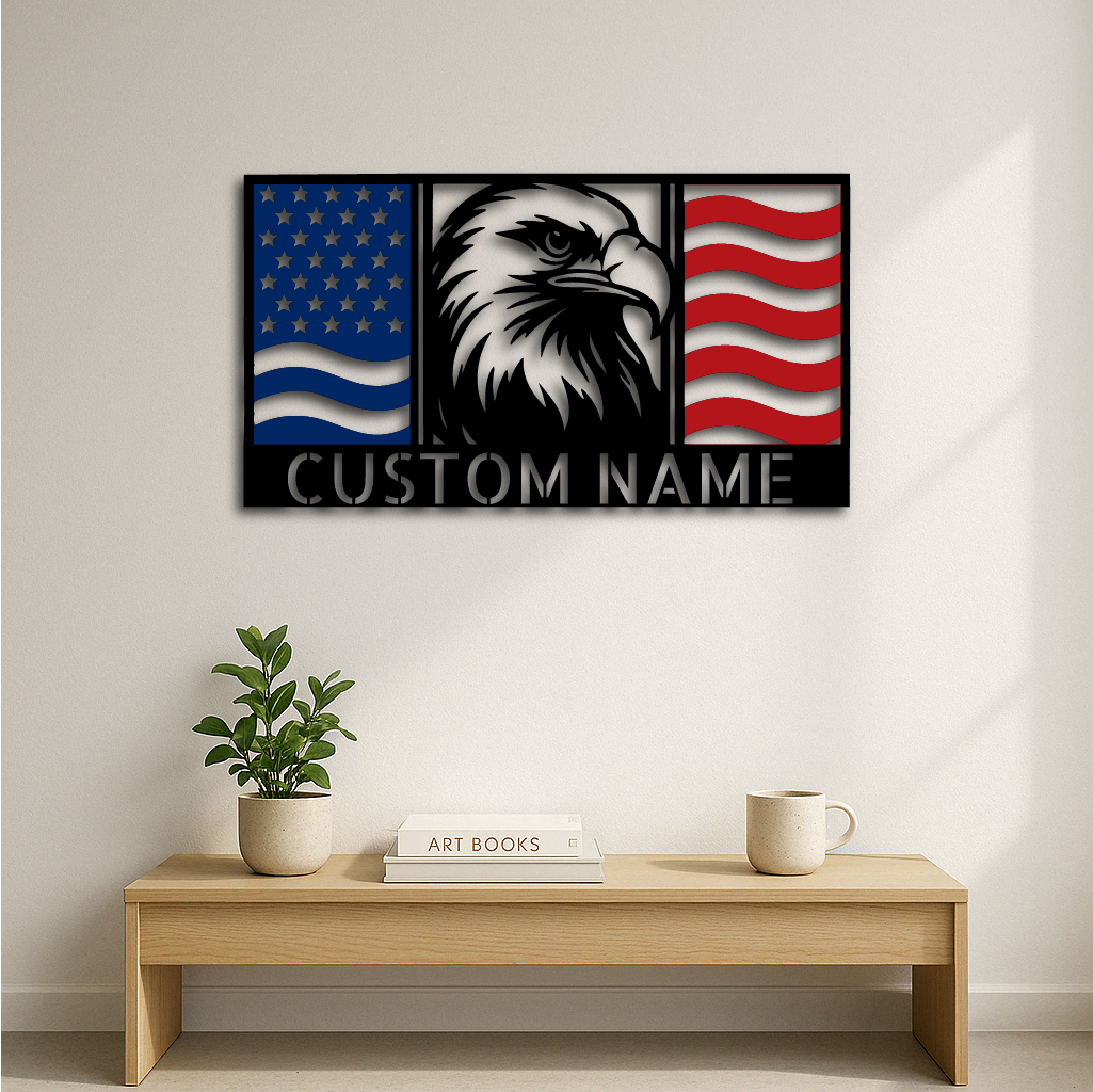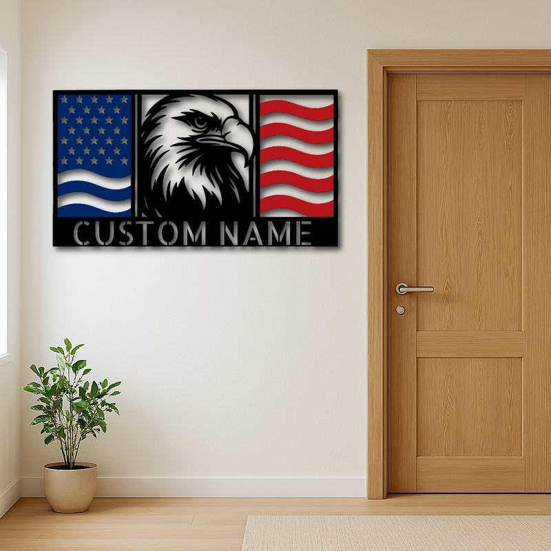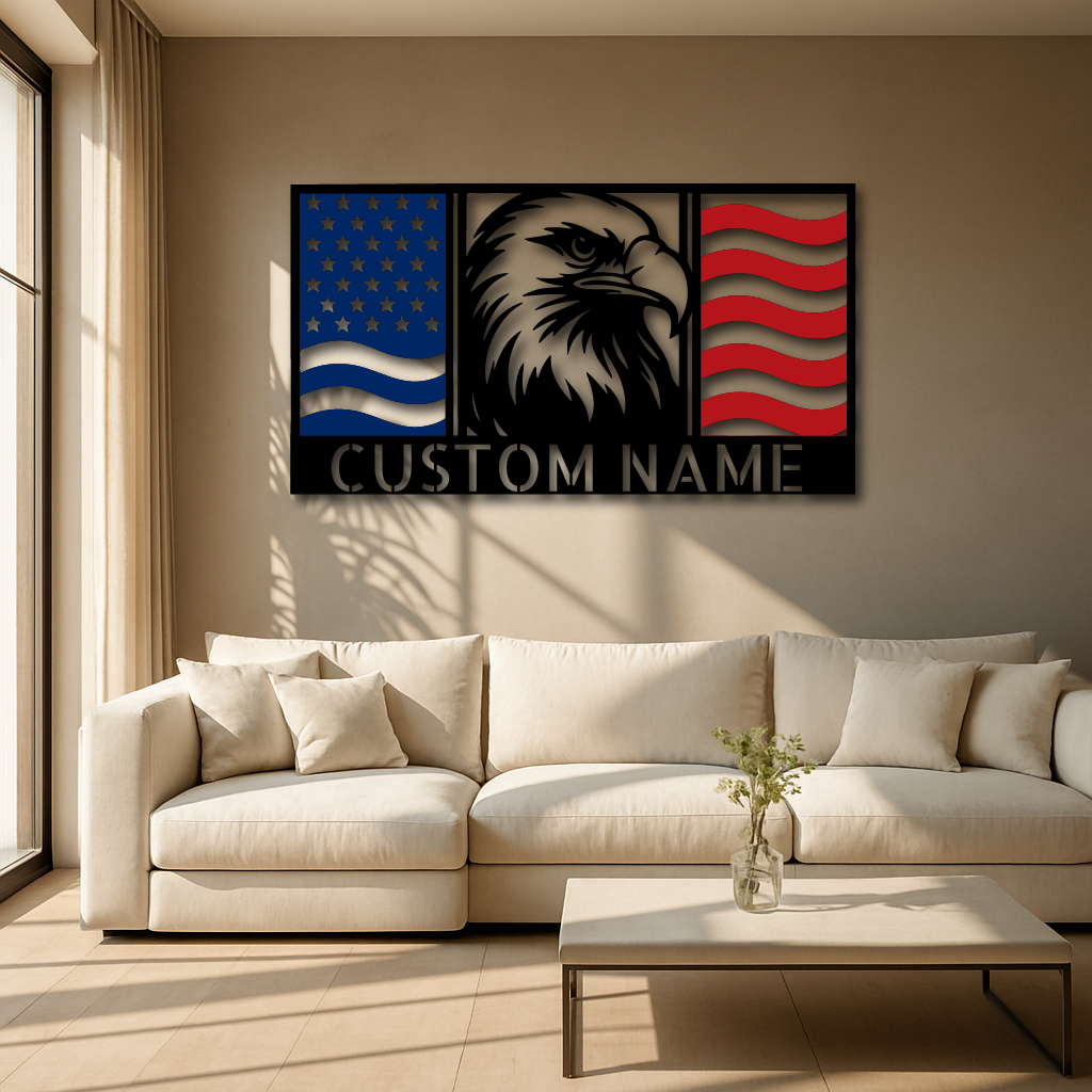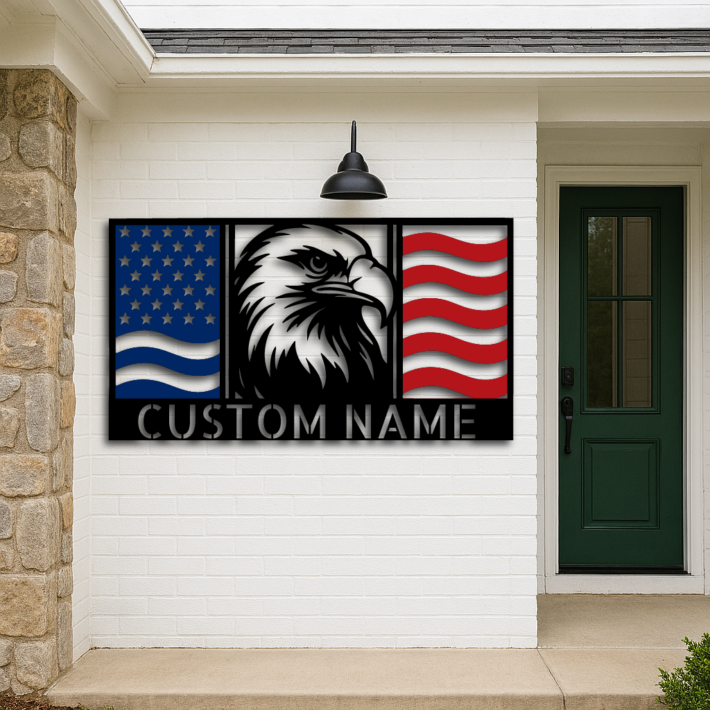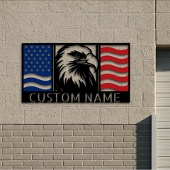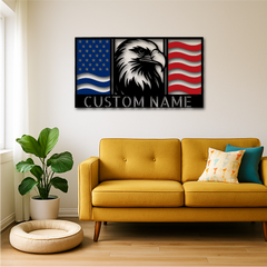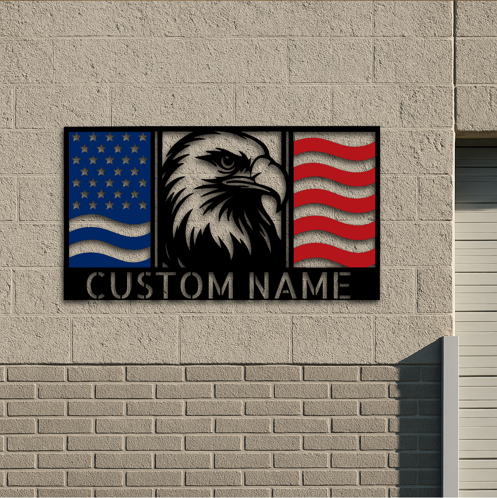Celebrate American pride with our Liberty Legacy custom metal wall sign — a bold tribute to patriotism, freedom, and personal legacy. This horizontal layout features the powerful American bald eagle centered between stylized red and white stripes and a star-spangled blue field. Perfectly balanced and precision-cut, this sign allows for a custom name or phrase at the bottom to make it truly your own.