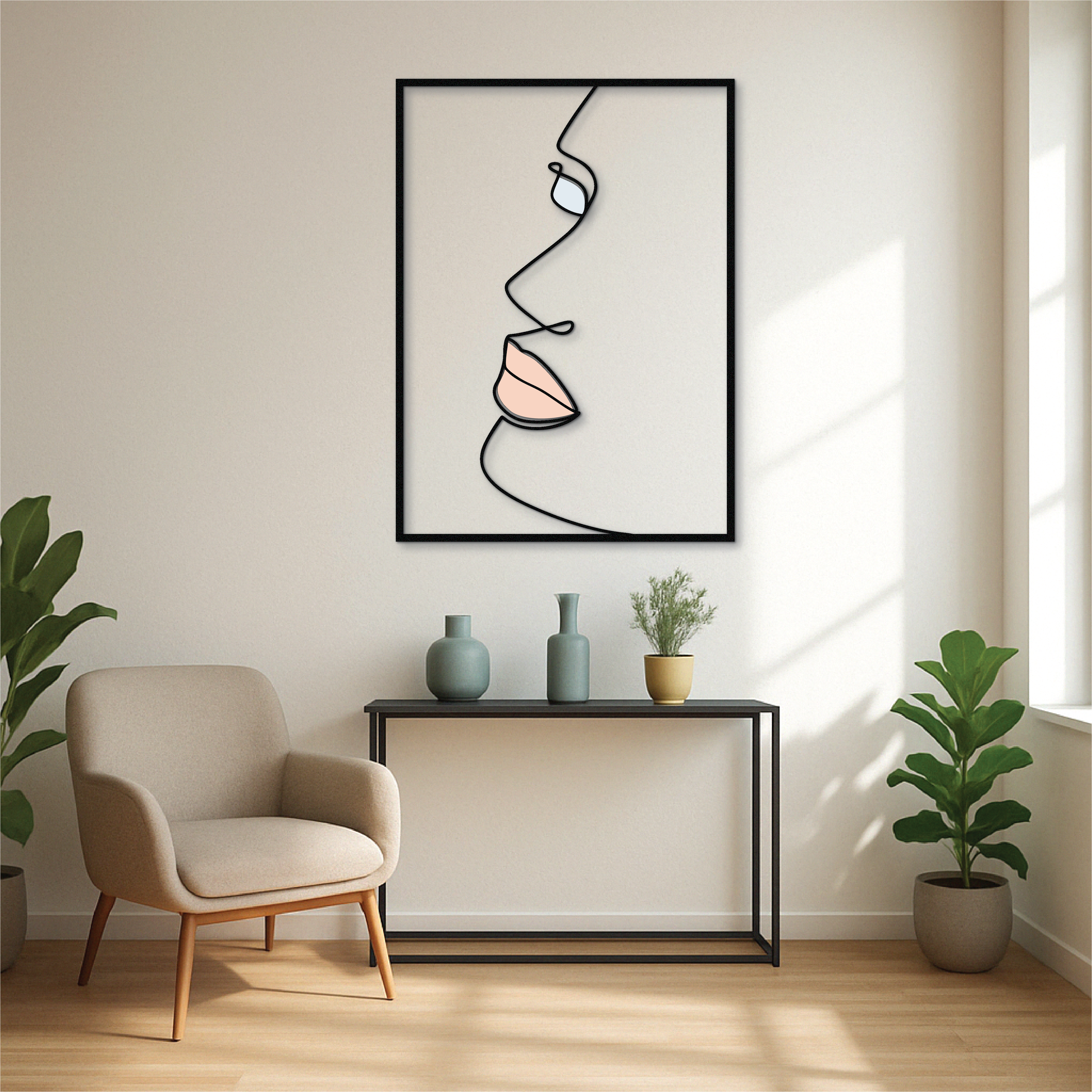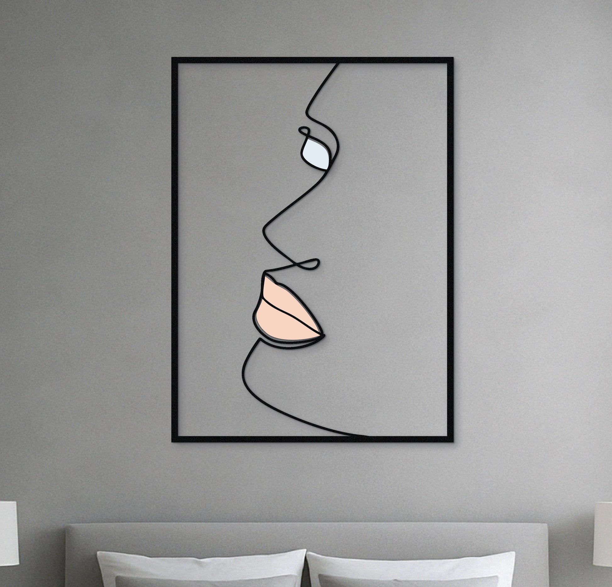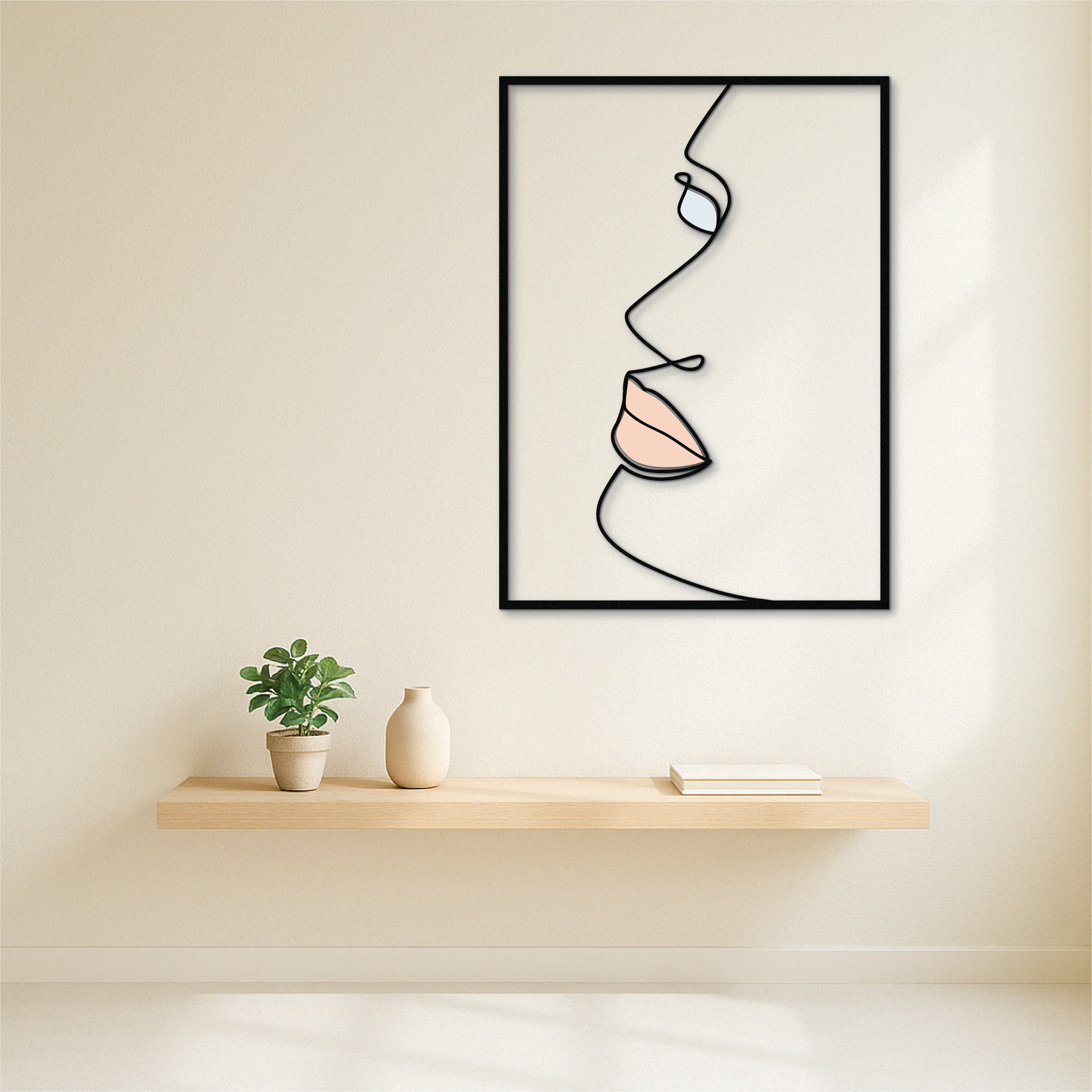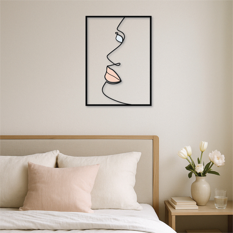 This modern side-profile face wall art is a study in elegance and simplicity. Crafted from solid metal and UV printed with delicate nude and pastel tones, it brings minimalist sophistication to any room. The flowing one-line design creates a soft, emotional presence — perfect for quiet, refined interiors.