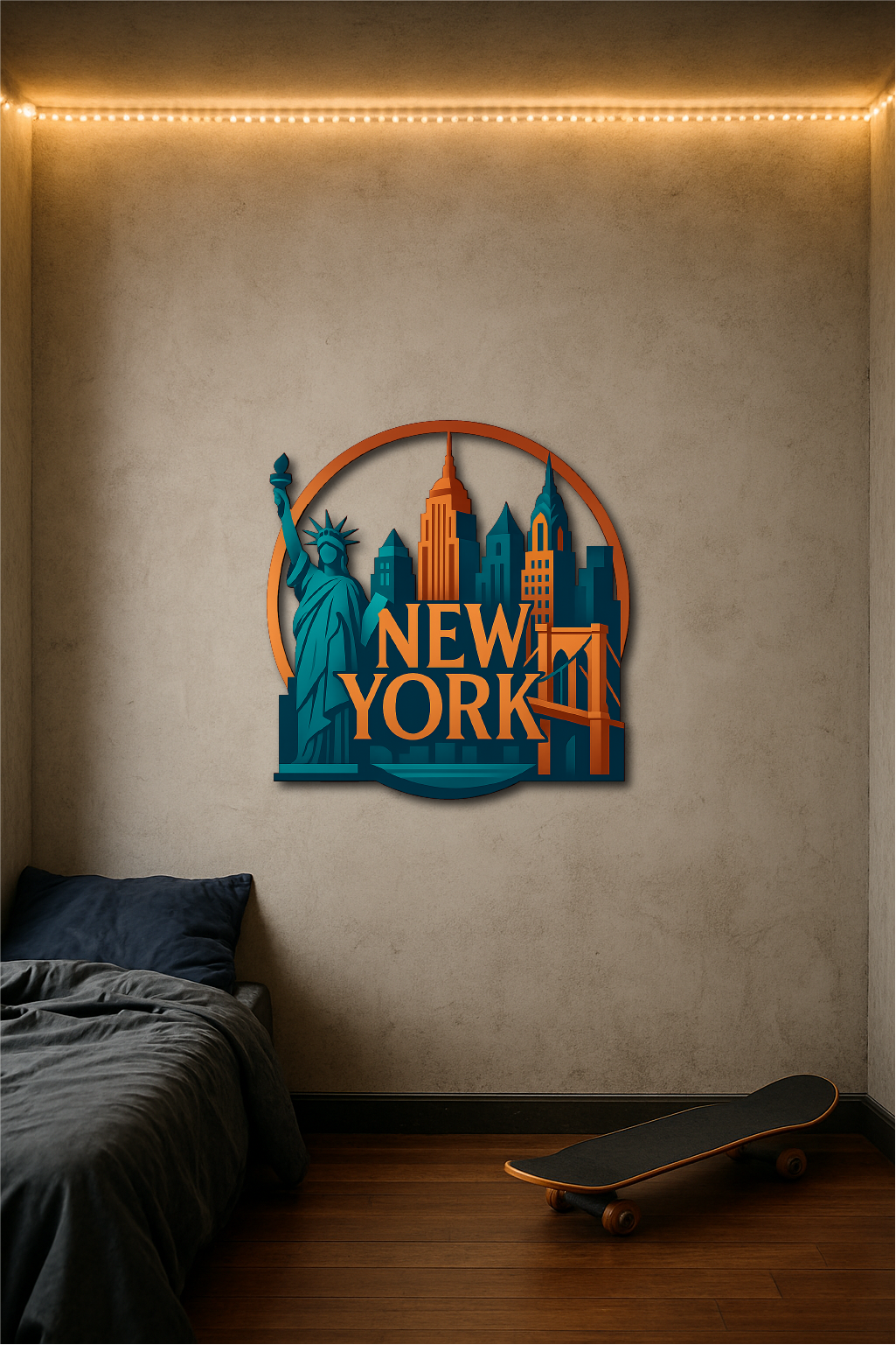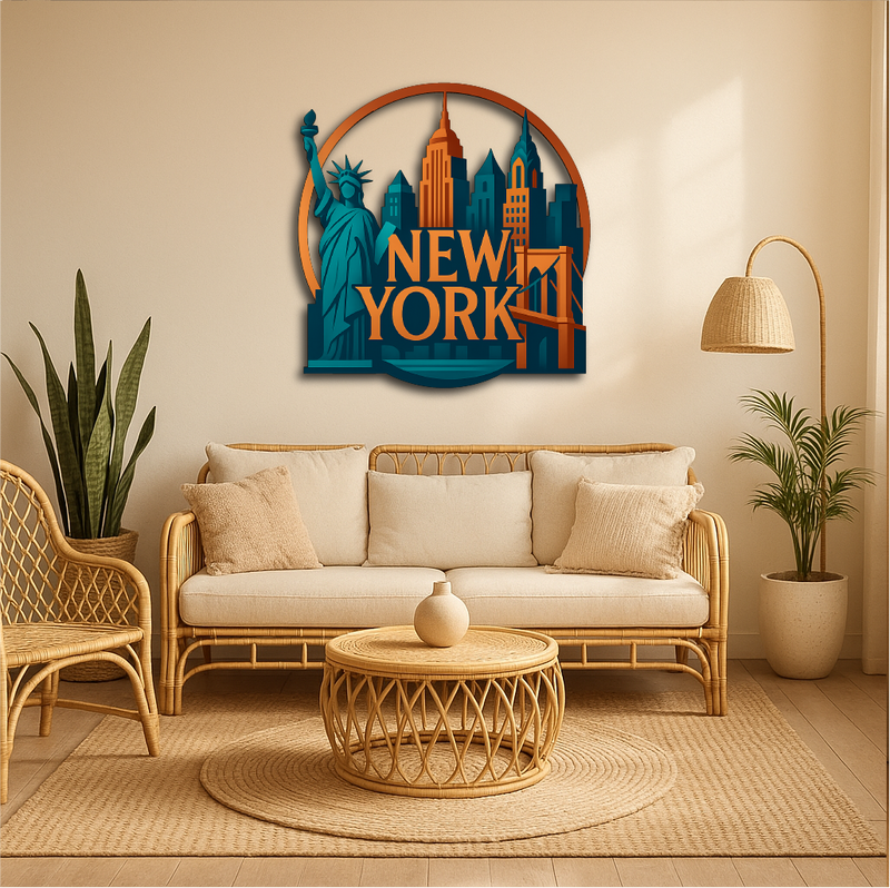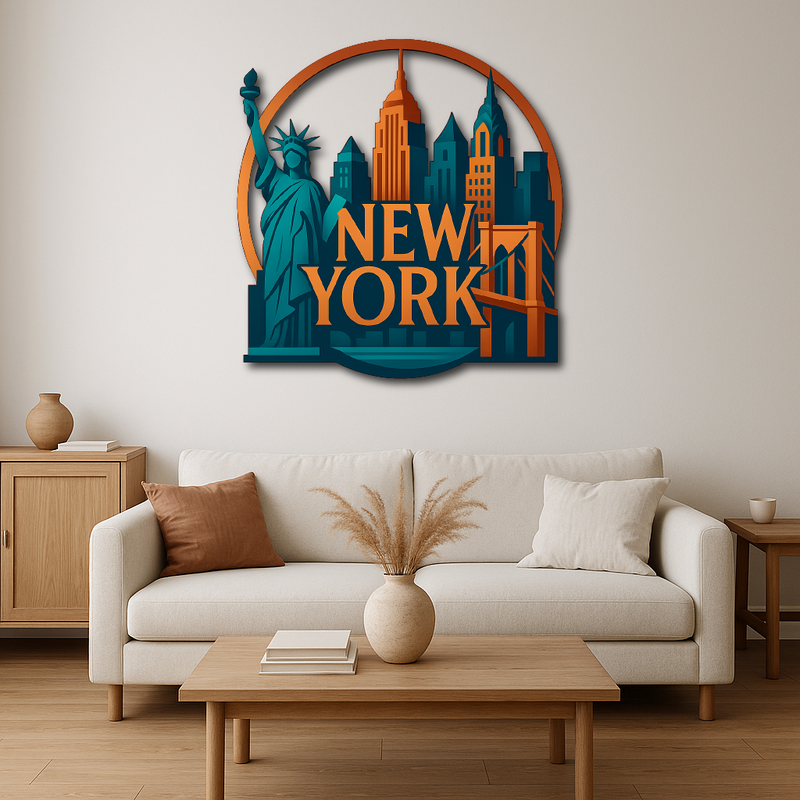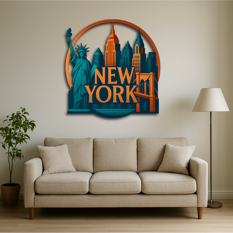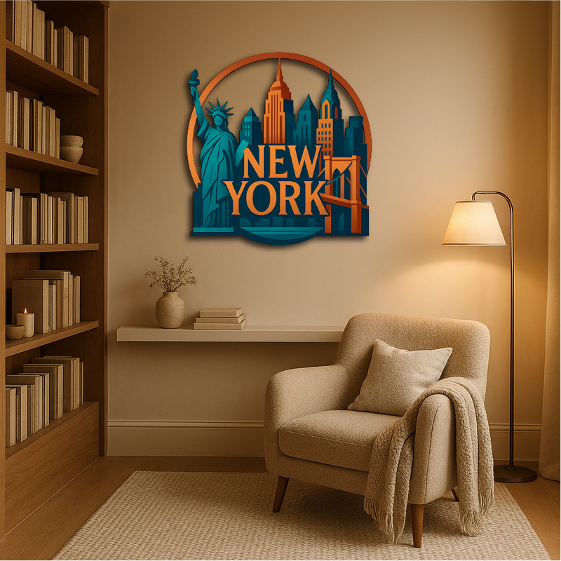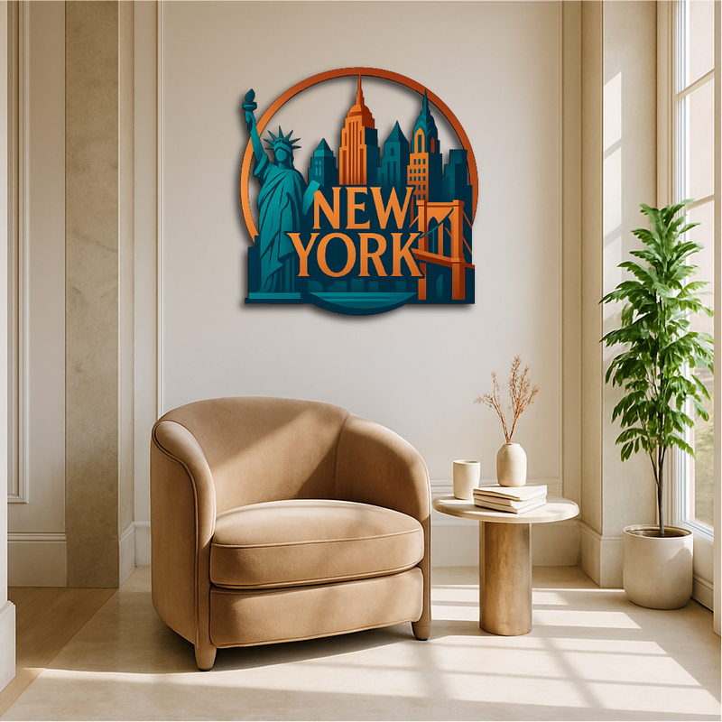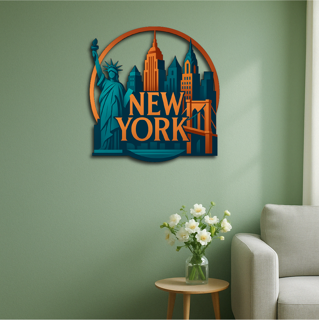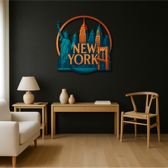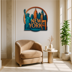 Celebrate the energy, architecture, and soul of the Big Apple with this New York Skyline Multicolor Metal Wall Art, featuring a dynamic cityscape complete with the Statue of Liberty, Empire State Building, Chrysler Building, and Brooklyn Bridge — all underlined by bold "NEW YORK" lettering.