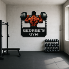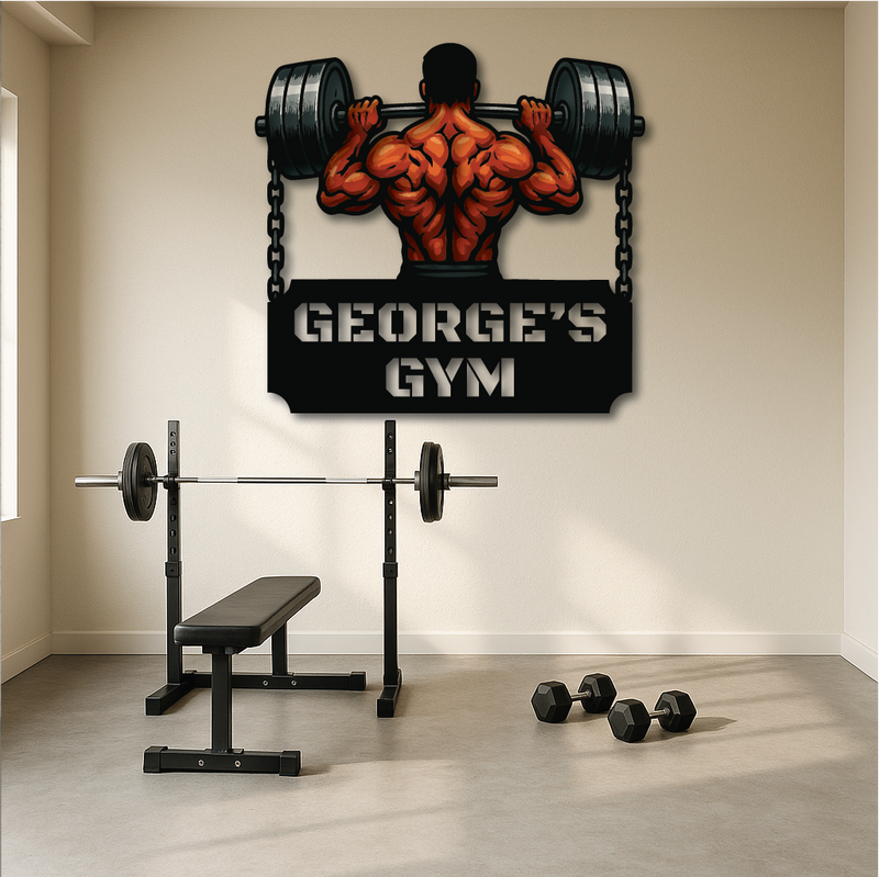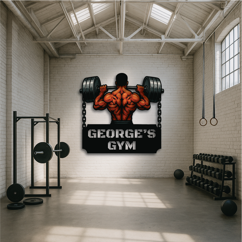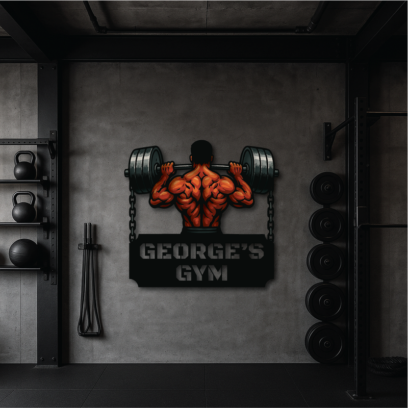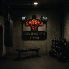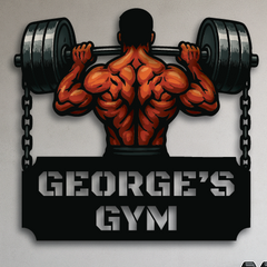 Bring raw power and fierce determination to your gym space with our Iron Will Custom Gym Sign. Featuring a muscular lifter gripping a massive barbell chained to either side, this personalized wall art is the ultimate symbol of strength and dedication. Perfect for home gyms, fitness centers, or as a bold gift for personal trainers and weightlifters.