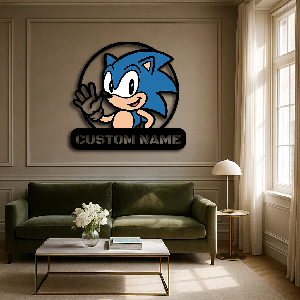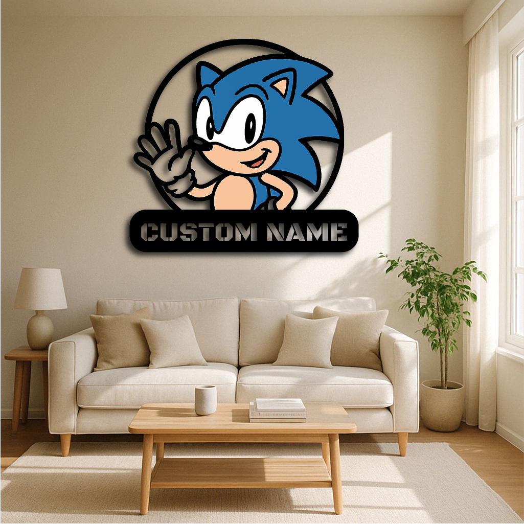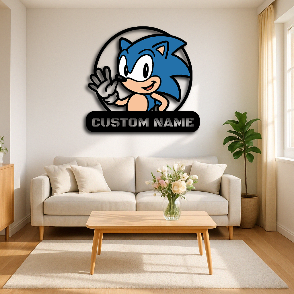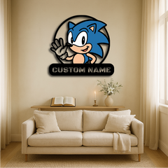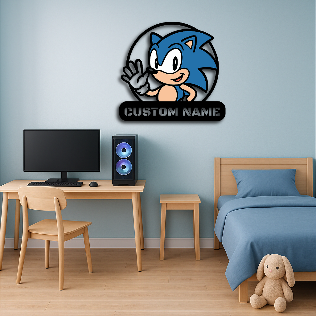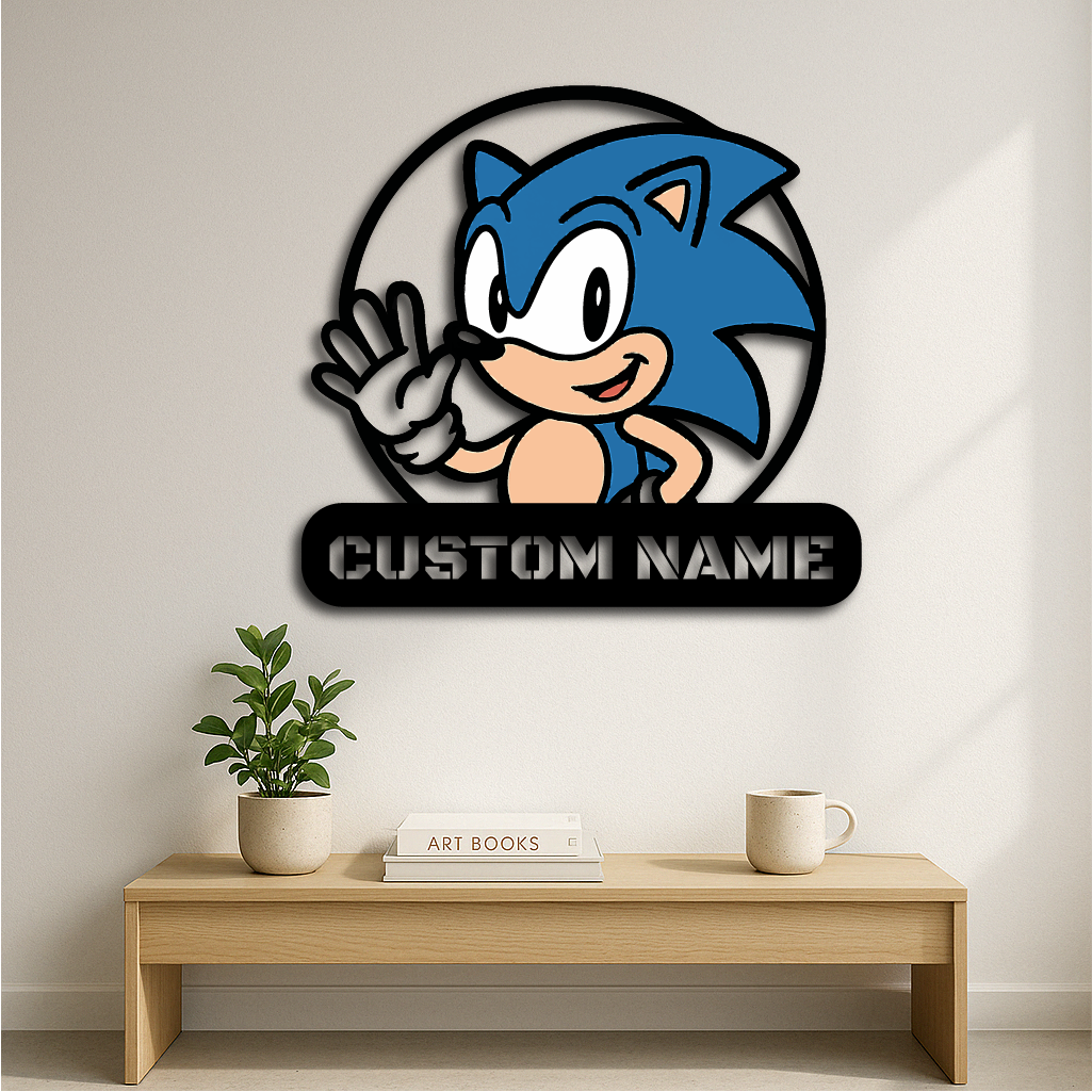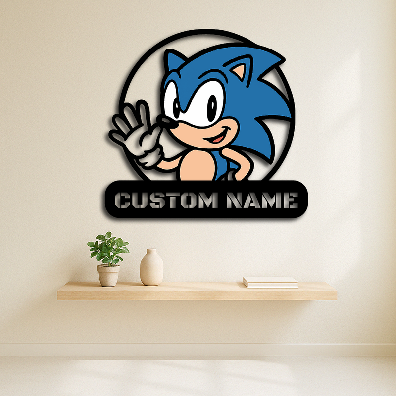 Crafted from premium steel and printed in vibrant multicolor, this unique wall sign features the iconic speedy hedgehog design with a customizable nameplate — perfect for kids, gamers, or anyone who loves classic video game characters.