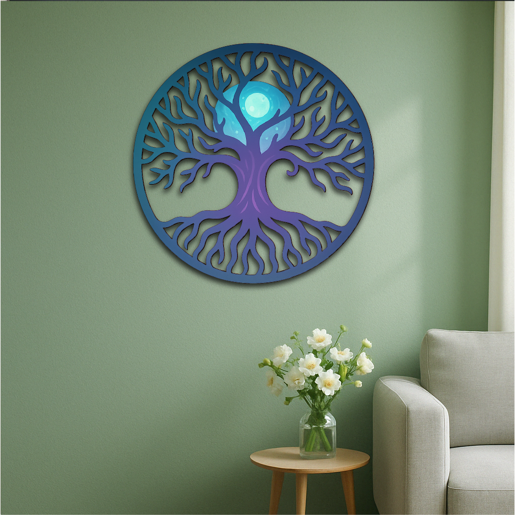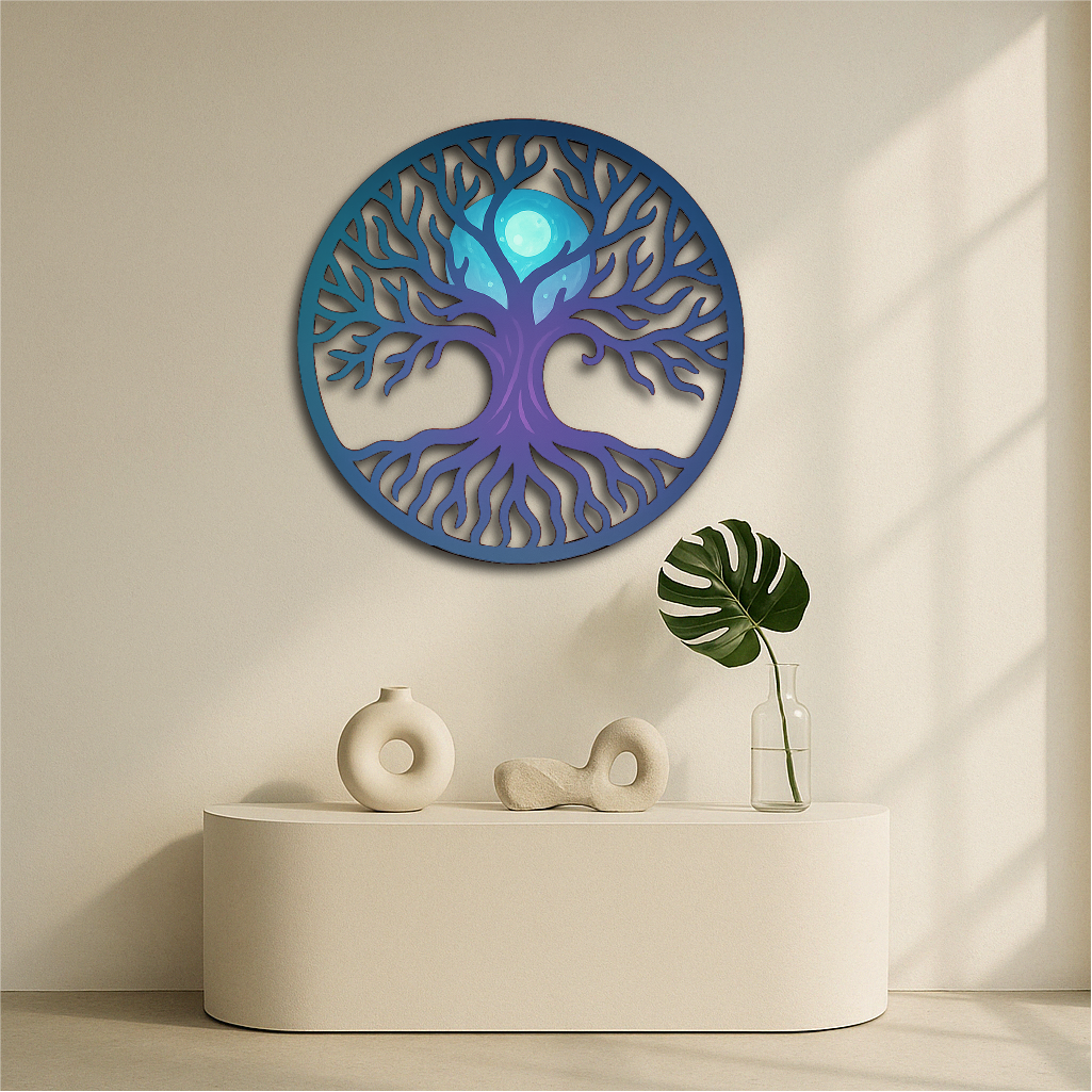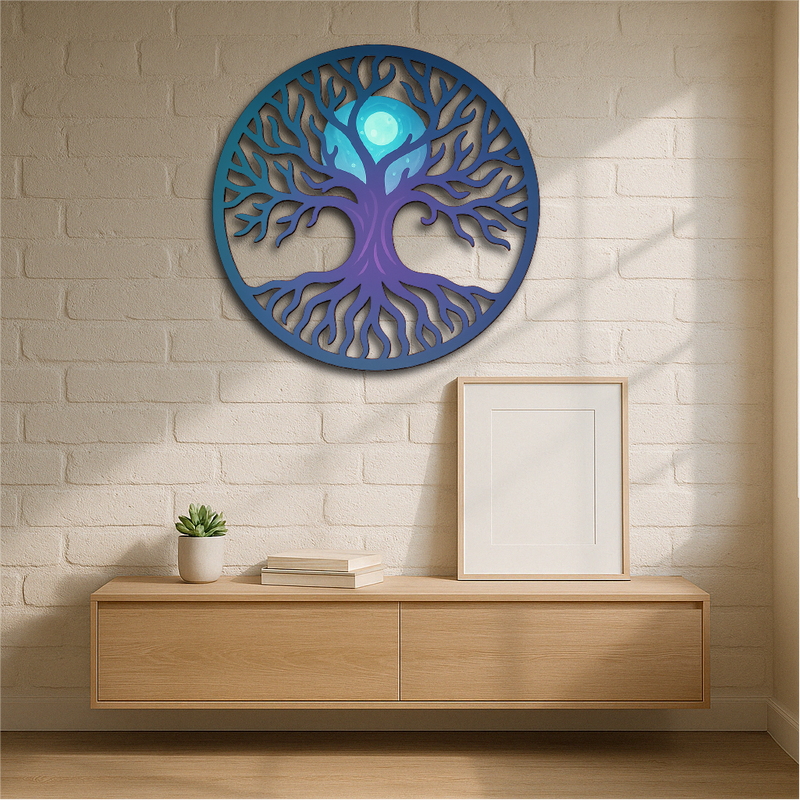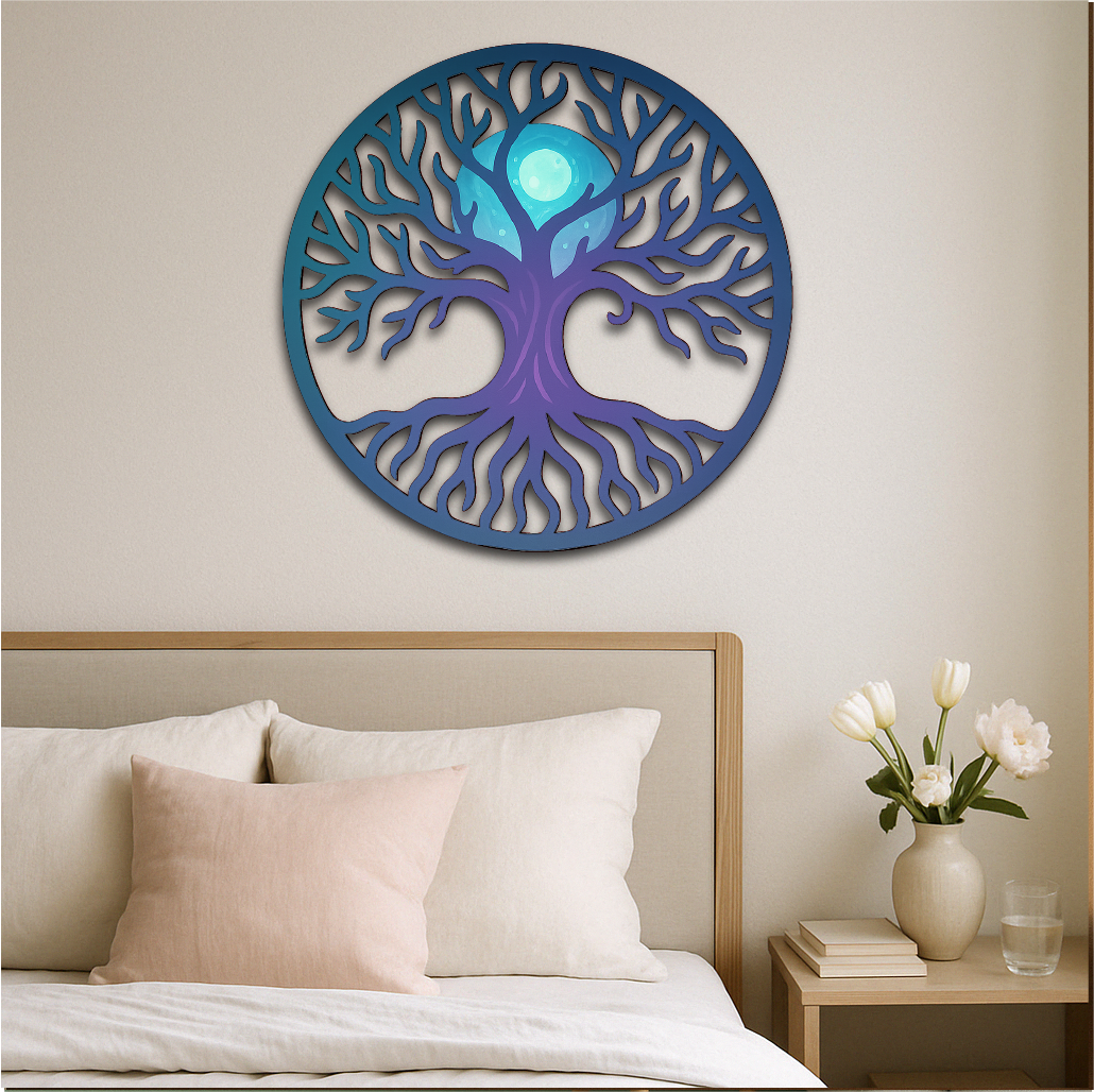 Celebrate connection, growth, and the beauty of life with this Tree of Life Multicolor Metal Wall Art, featuring a sprawling tree silhouette with intertwining branches and roots encircling a glowing full moon. The gradient tones of deep purple and celestial blue create a mystical and grounding effect, perfect for peaceful and intentional interiors.