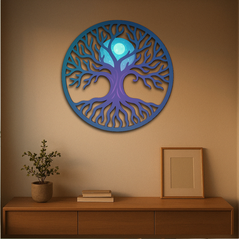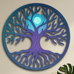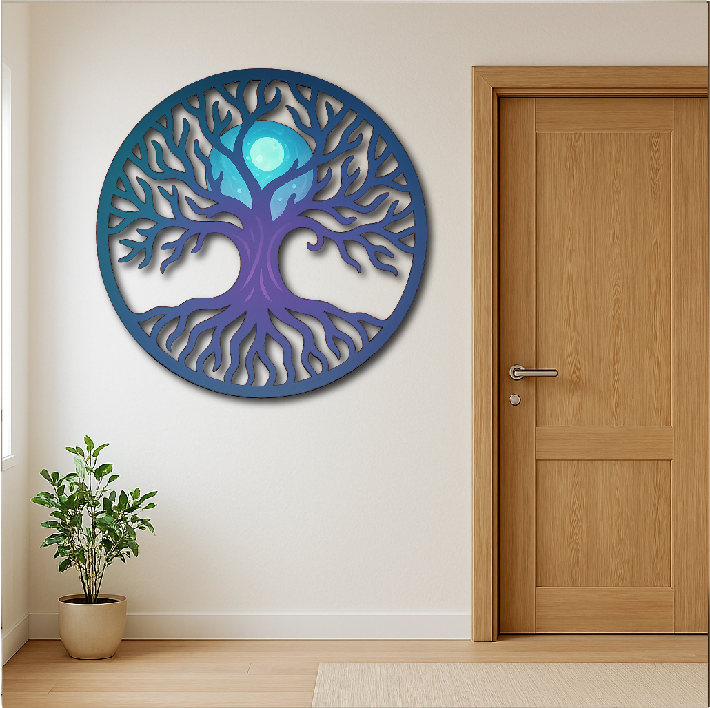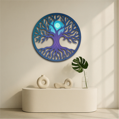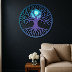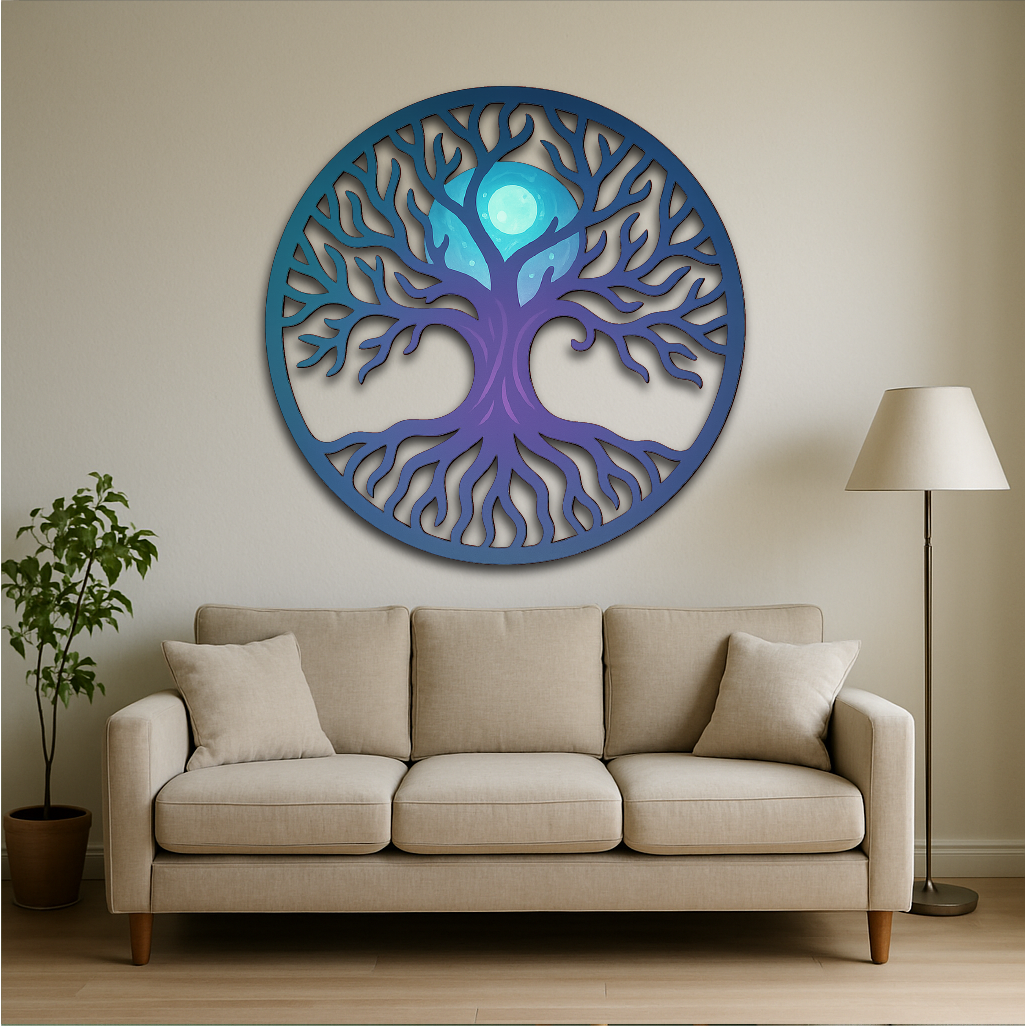 Celebrate connection, growth, and the beauty of life with this Tree of Life Multicolor Metal Wall Art, featuring a sprawling tree silhouette with intertwining branches and roots encircling a glowing full moon. The gradient tones of deep purple and celestial blue create a mystical and grounding effect, perfect for peaceful and intentional interiors.