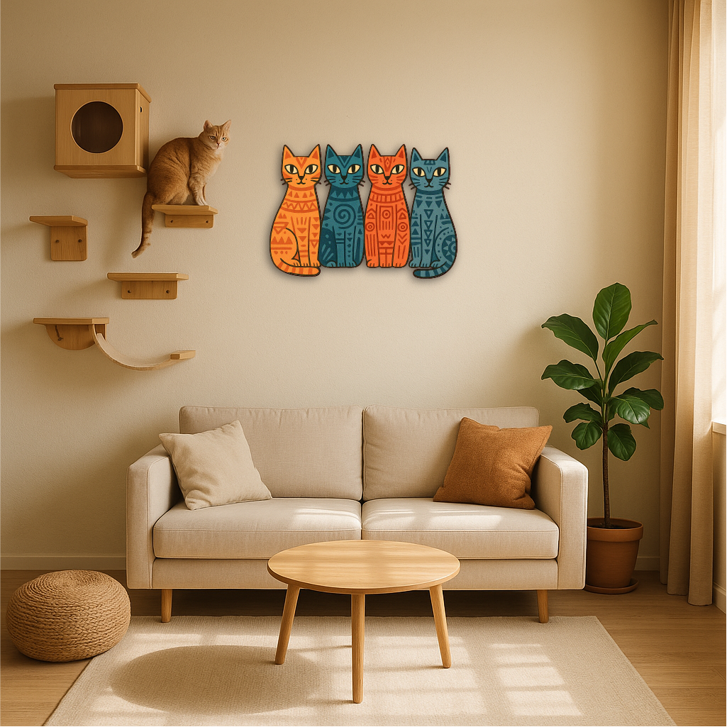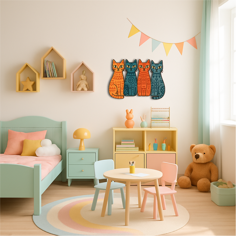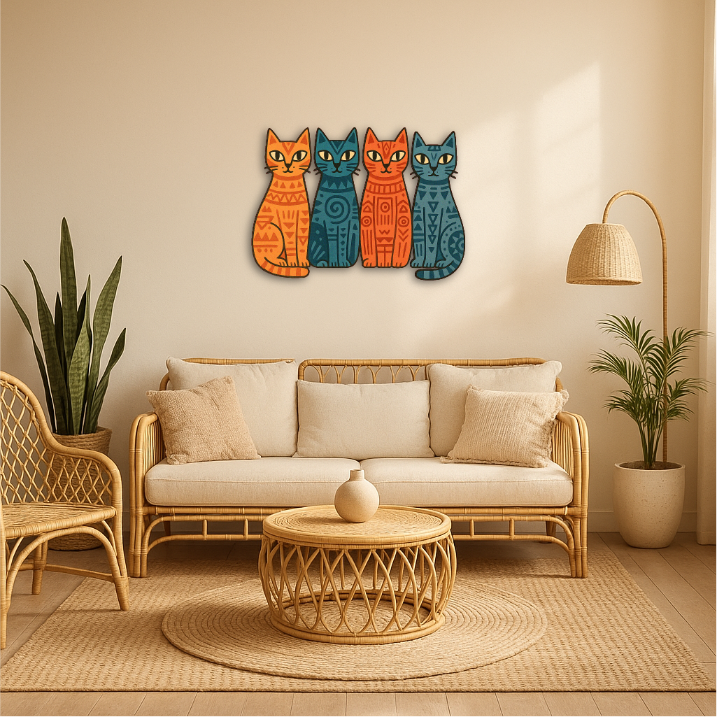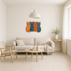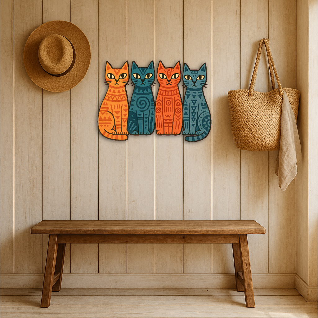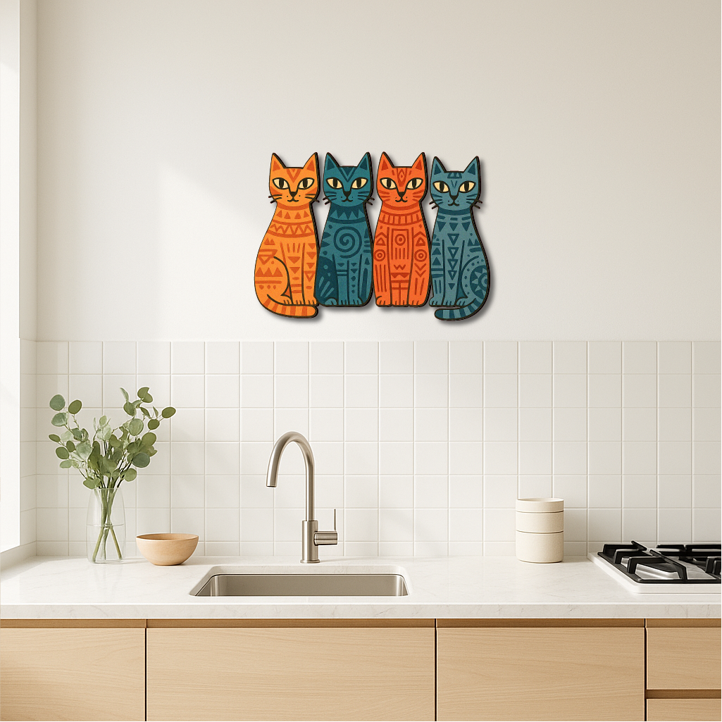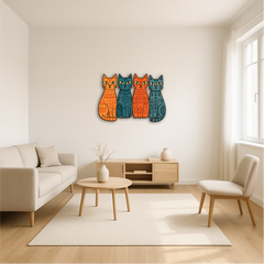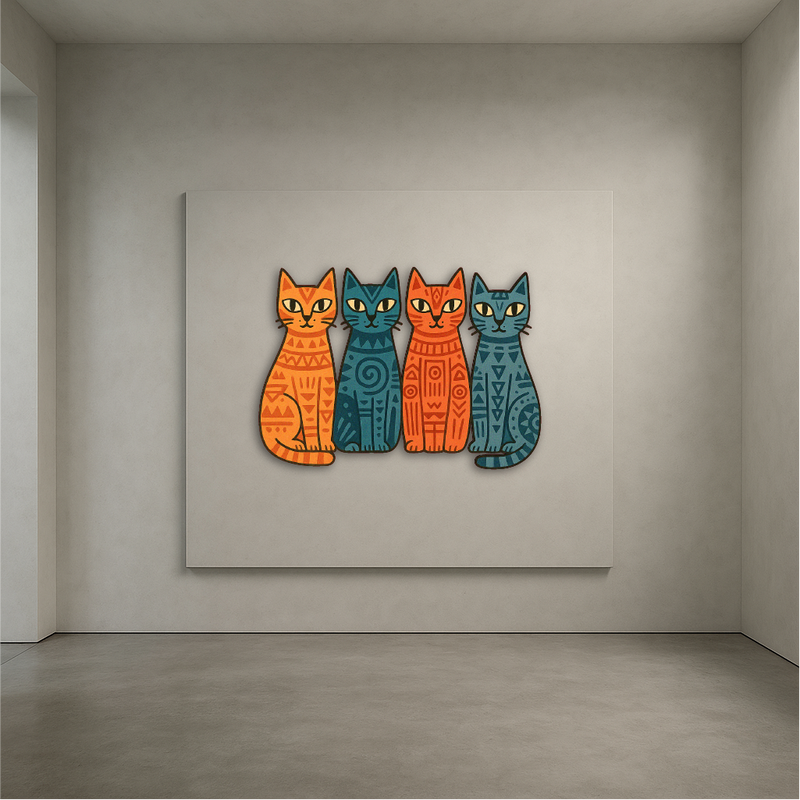 Add a playful yet artistic vibe to your space with this Tribal Cats Multicolor Metal Wall Art, featuring four stylized felines in vivid orange, teal, and navy hues, each adorned with tribal-inspired geometric patterns. The symmetrical composition and bold contrast give this piece a modern, bohemian charm — perfect for any cat lover with a taste for the unique.